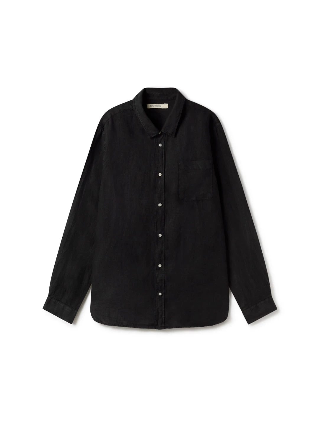 A classic and striking linen shirt. Designed with a regular collar, a pocket on the chest, naturally sourced corozo buttons and embroidery along the bottom of the placket.Â