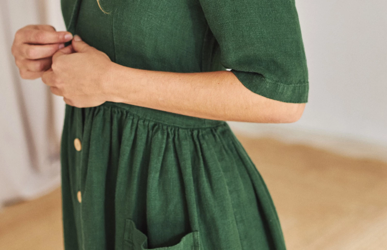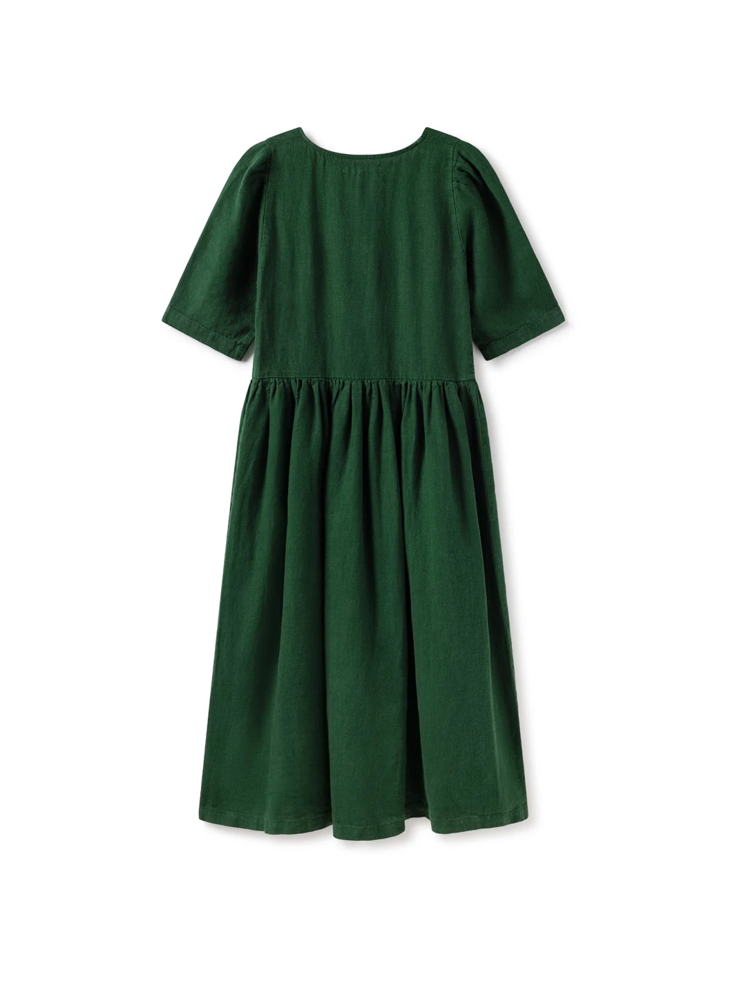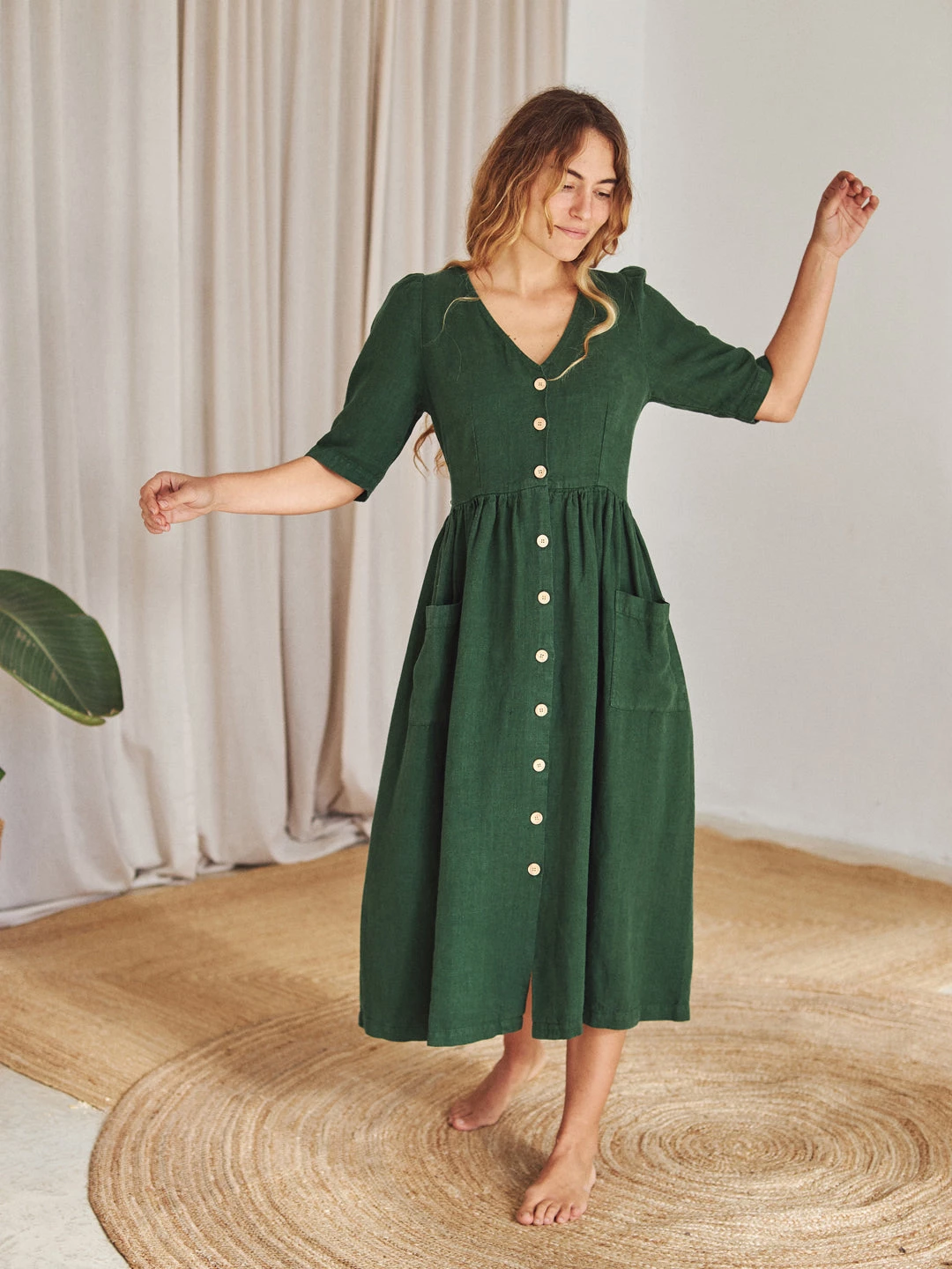 The Owey linen dress is beautifully crafted. Carefully designed with a round neckline and wooden buttons to match the sustainability of the fabric. It has a regular fit but is rather loose on the skirt area, falling around the calves.