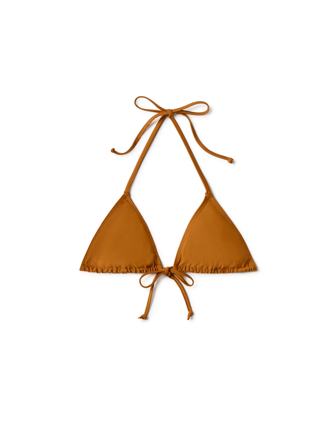 The Pabay top is a triangular style bikini crafted mainly with recycled plastics and a touch of elastane to fit better. With gathered bottoms and strings that knot on the front and nape.