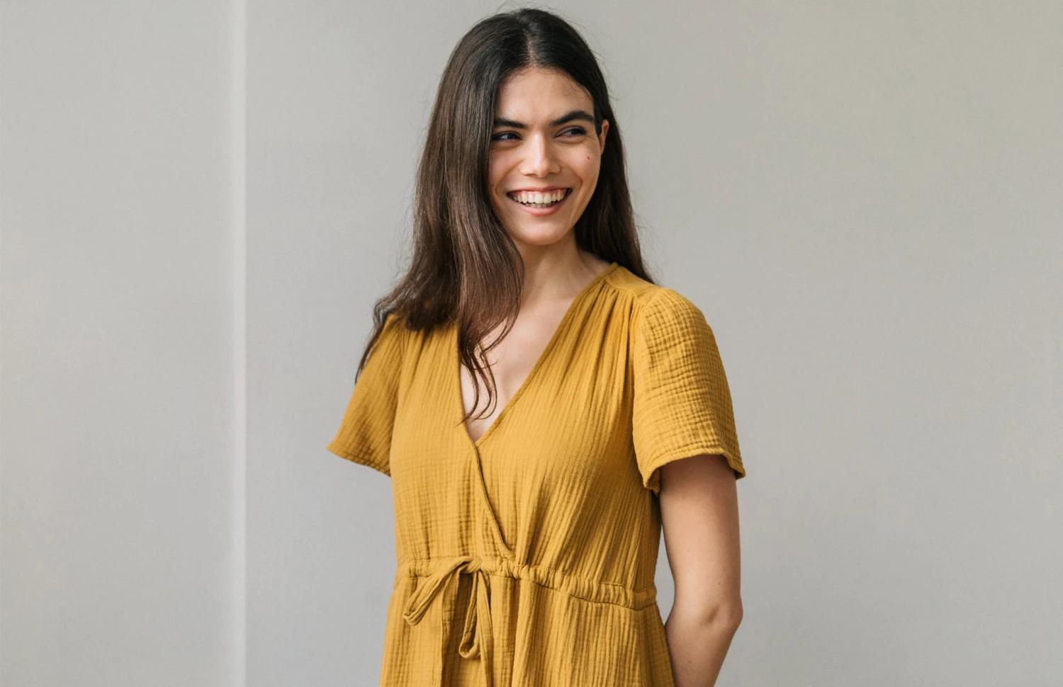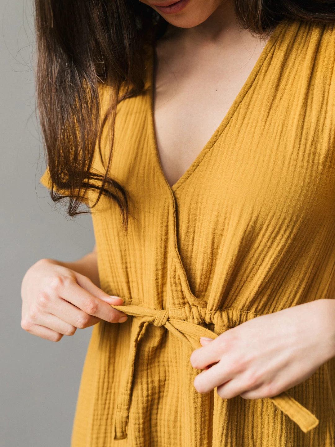 We are excited to bring the Sabinal to our latest collection: a soft and flowy dress – perfect for the warmer seasons. Designed with a crossed triangular opened neckline, a cord adjustable waist and loose sleeves with gathered shoulders. It comes in a loose fit and falls above the knees.