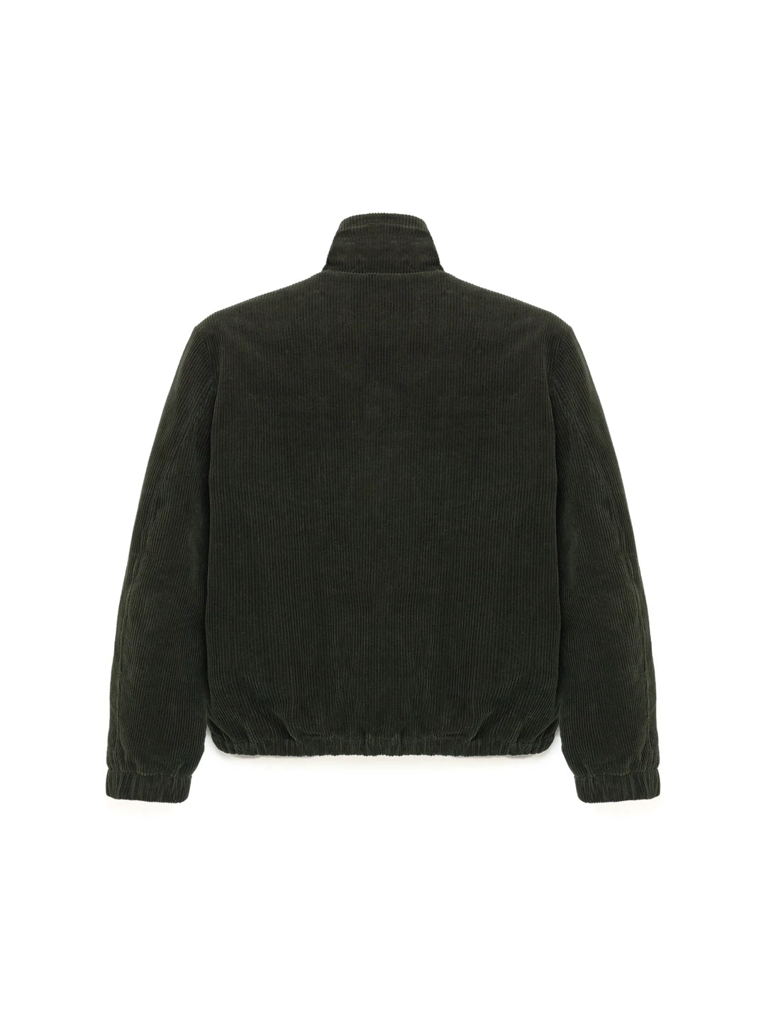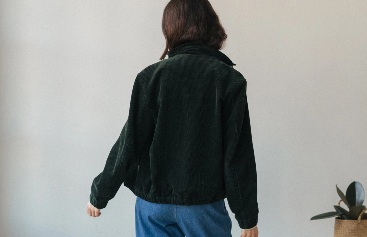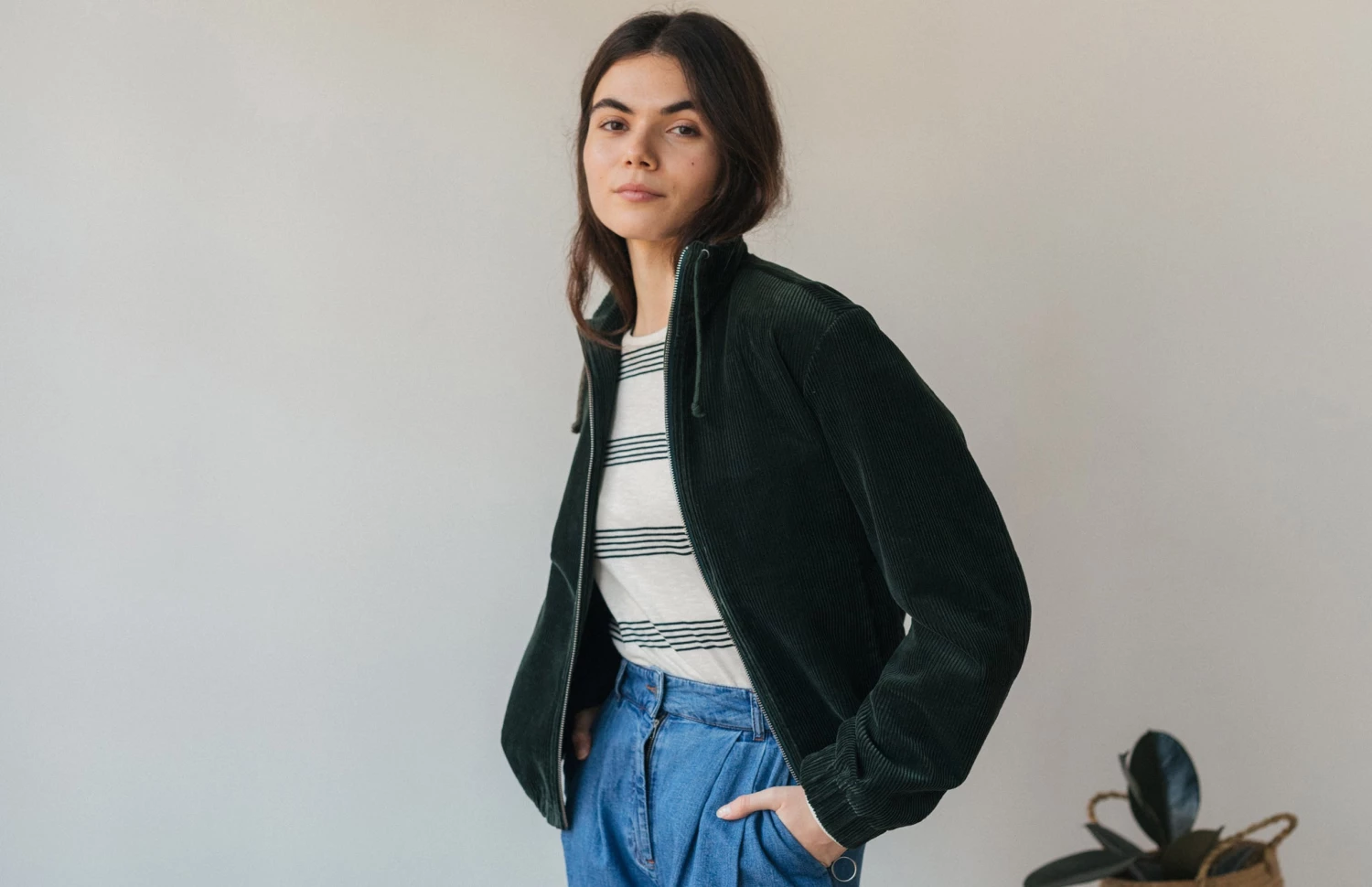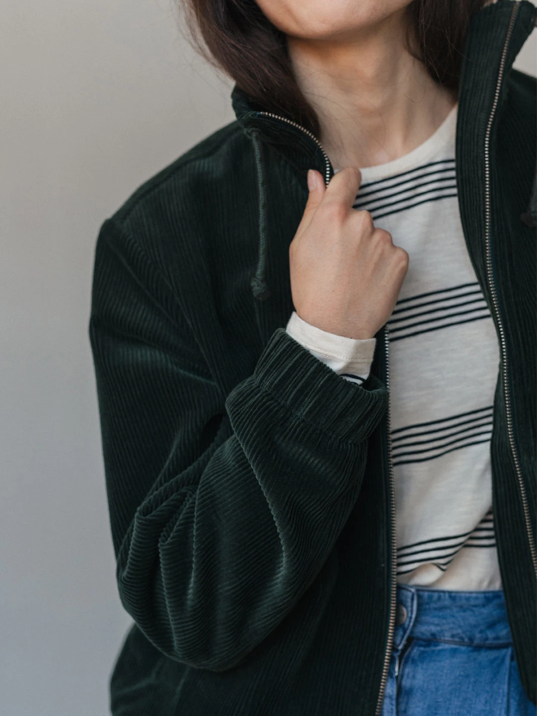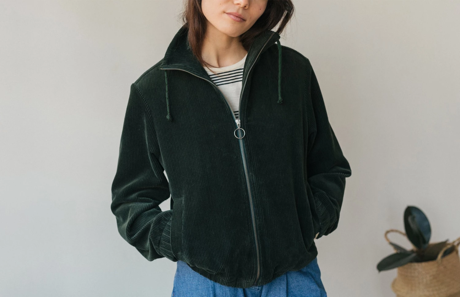 Organic corduroy and a comfy feeling are what makes the Evans jacket special. It is designed with a high neckline that has a drawstring puller to adjust, dropped shoulders and 3 pockets in total – one on the inside. The Evans has elastic inside the bottom and cuffs and it comes in a fairly oversized fit and hip-length cut.