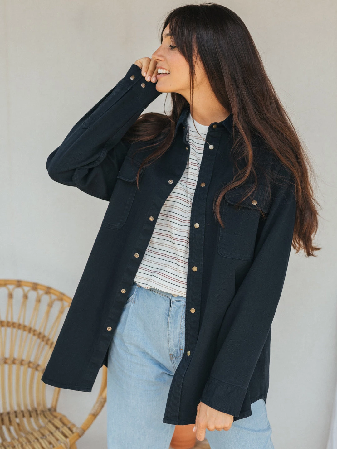 The Maya is our new shirt-style jacket with micro corduroy detailing, perfect for in-between seasons. The 2 chest pockets, adjustable cuffs and placket all close with snap buttons. This garment has a long oversized fit and falls right above the knees.Â