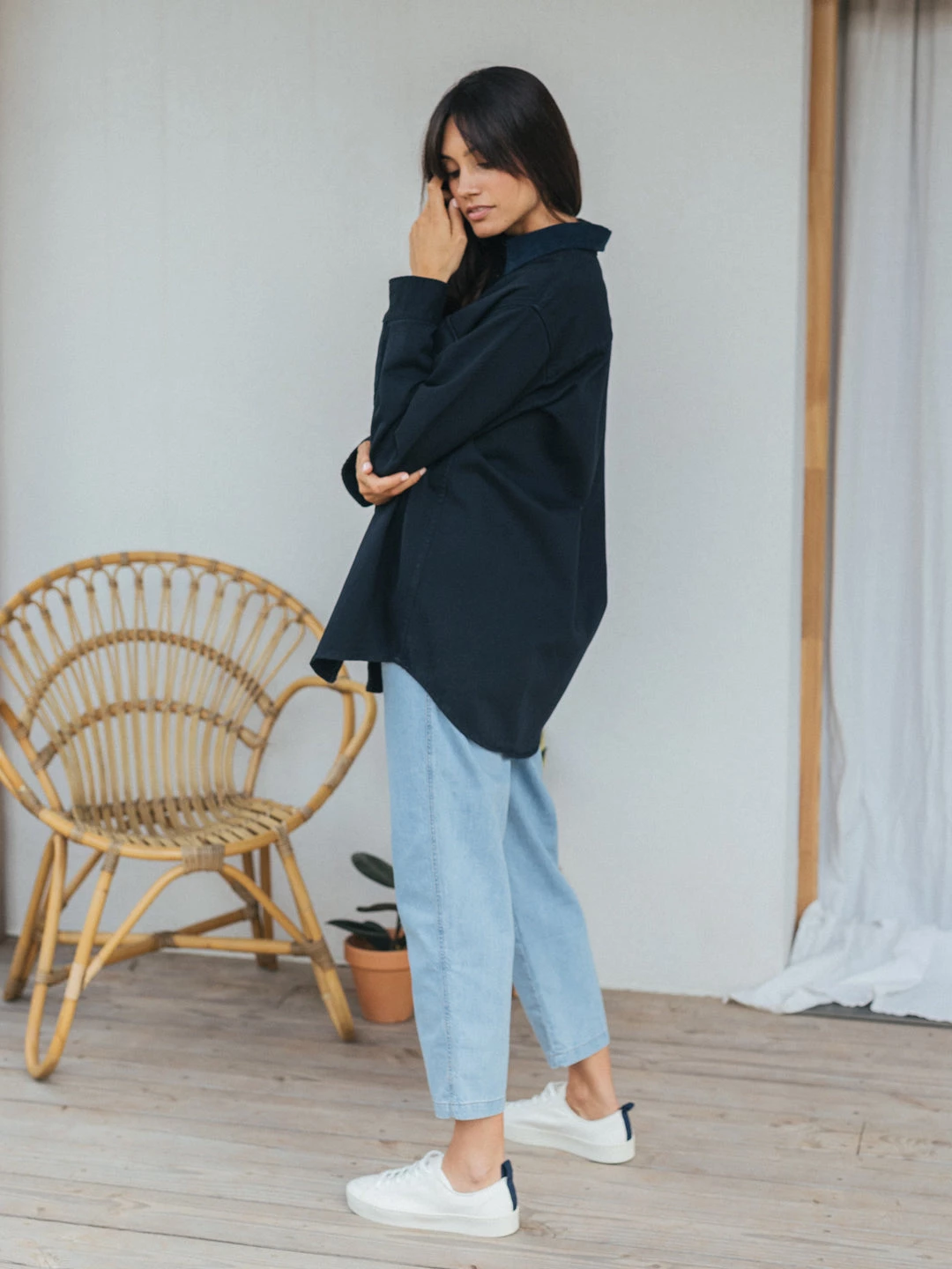 Thanks to the Maya’s fit it matches wonderfully with slimmer clothes. We love buttoning the jacket only halfway and pairing it with a cropped knit or top, depending on the weather. Perfect with straight cut jeans.Â
