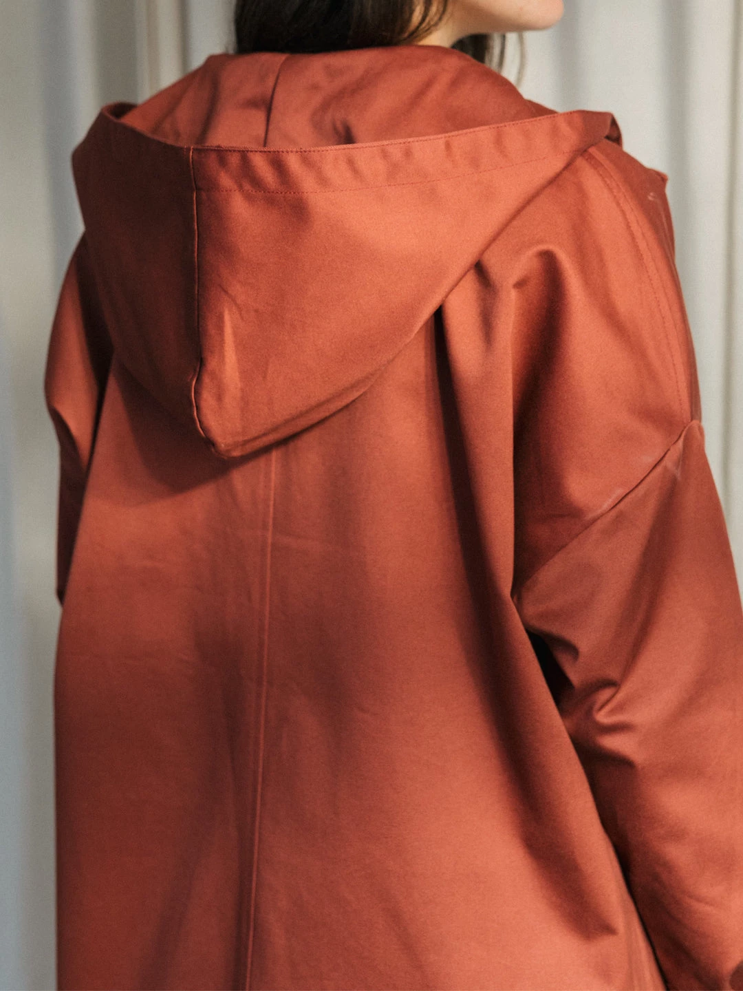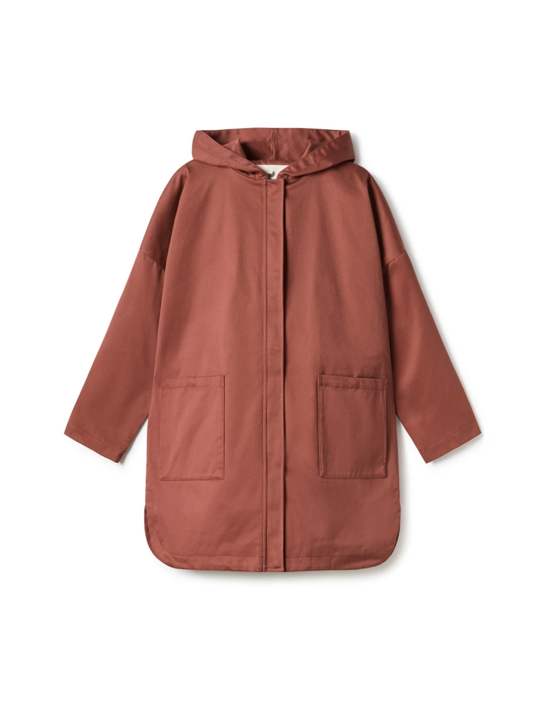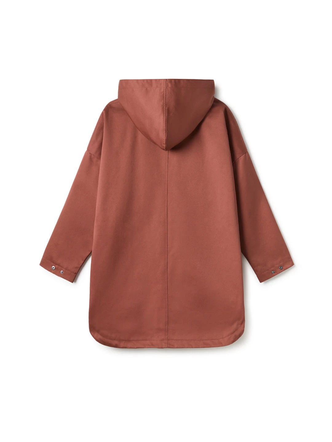 The Sanana parka is a water-repellent coat, perfect for spring rainy days! It comes with a hood, a placket covering the front, two big pockets on the bottom front and one on the inside and snap buttons on the wrists to adjust to your liking. The jacket is designed with a loose fit for maximum comfort, falling below the waist.