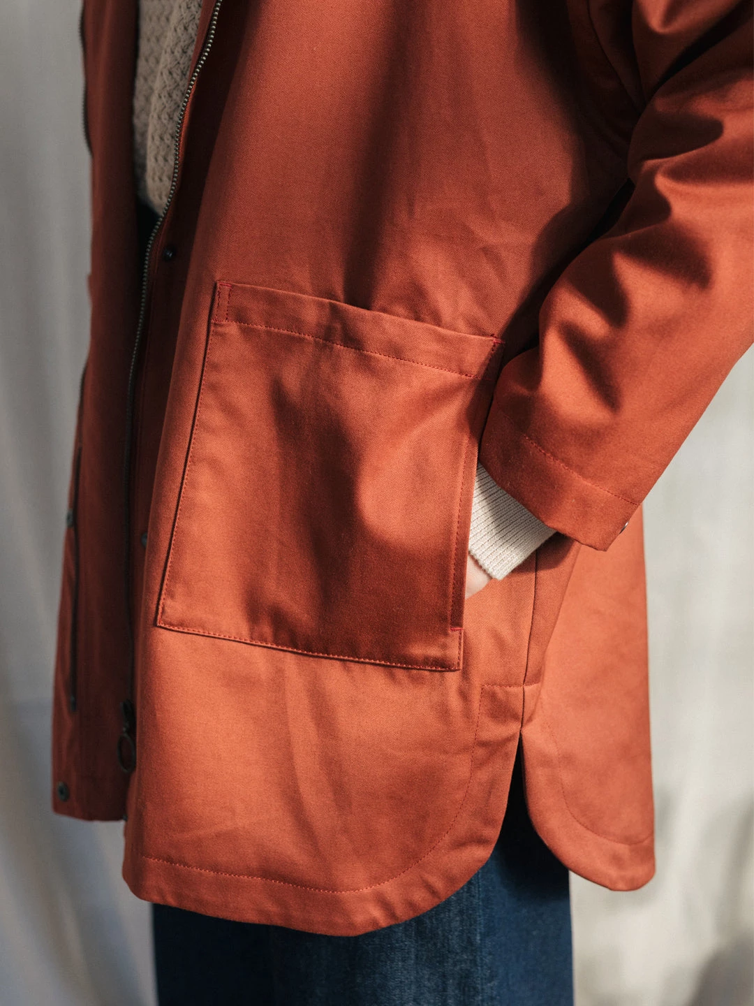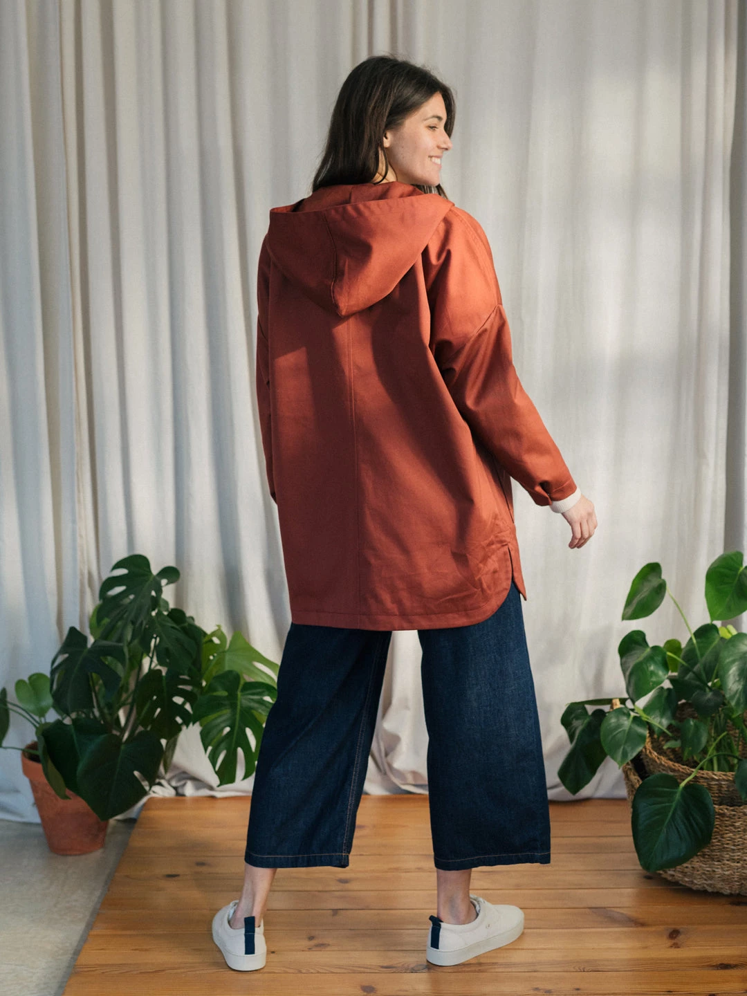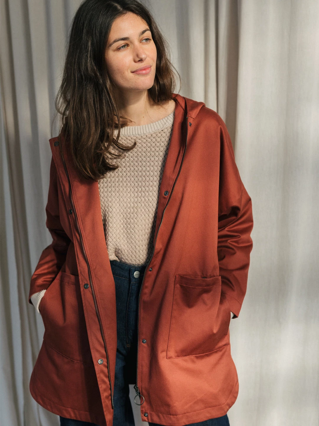 The Sanana parka is a water-repellent coat, perfect for spring rainy days! It comes with a hood, a placket covering the front, two big pockets on the bottom front and one on the inside and snap buttons on the wrists to adjust to your liking. The jacket is designed with a loose fit for maximum comfort, falling below the waist.