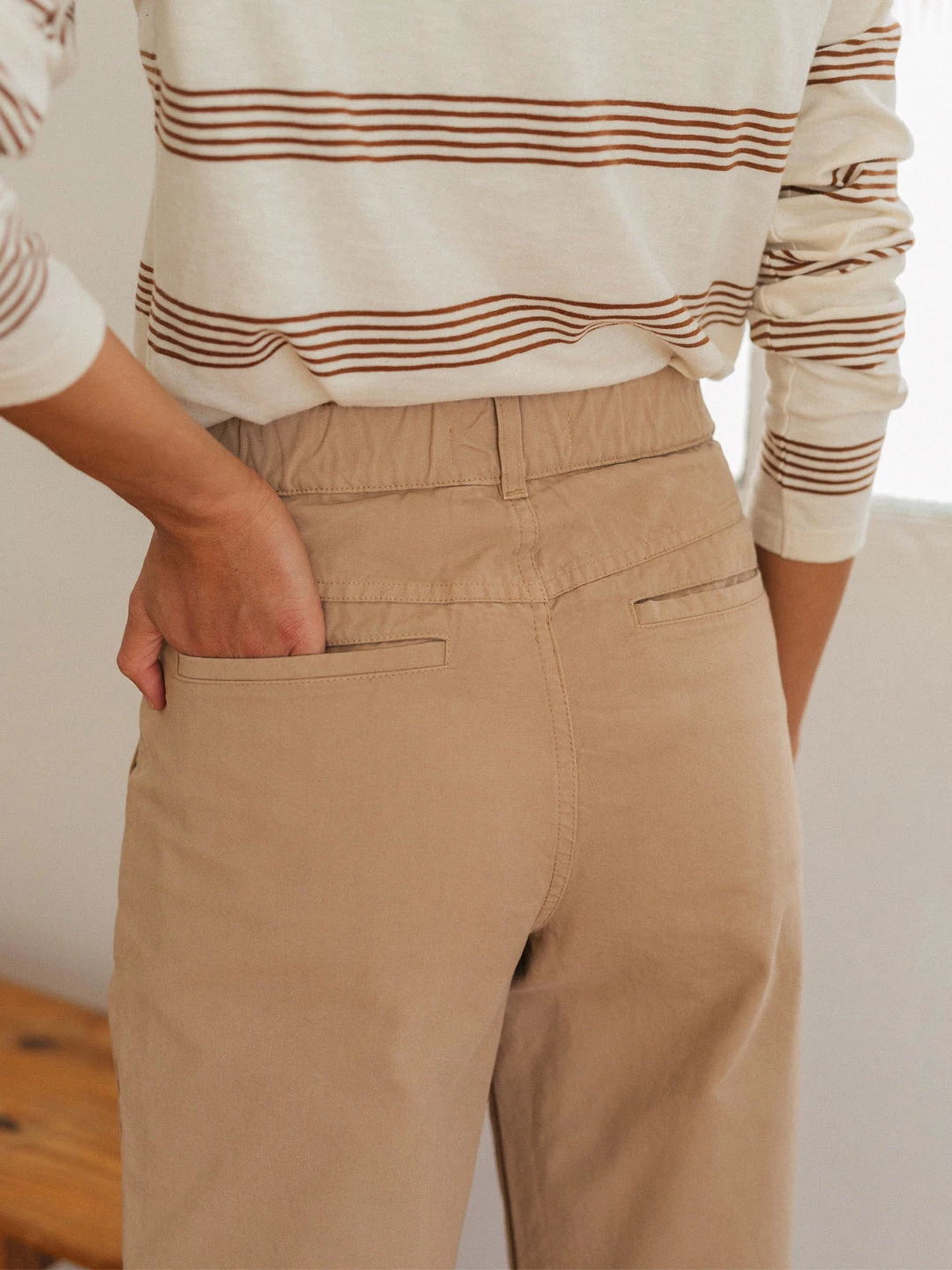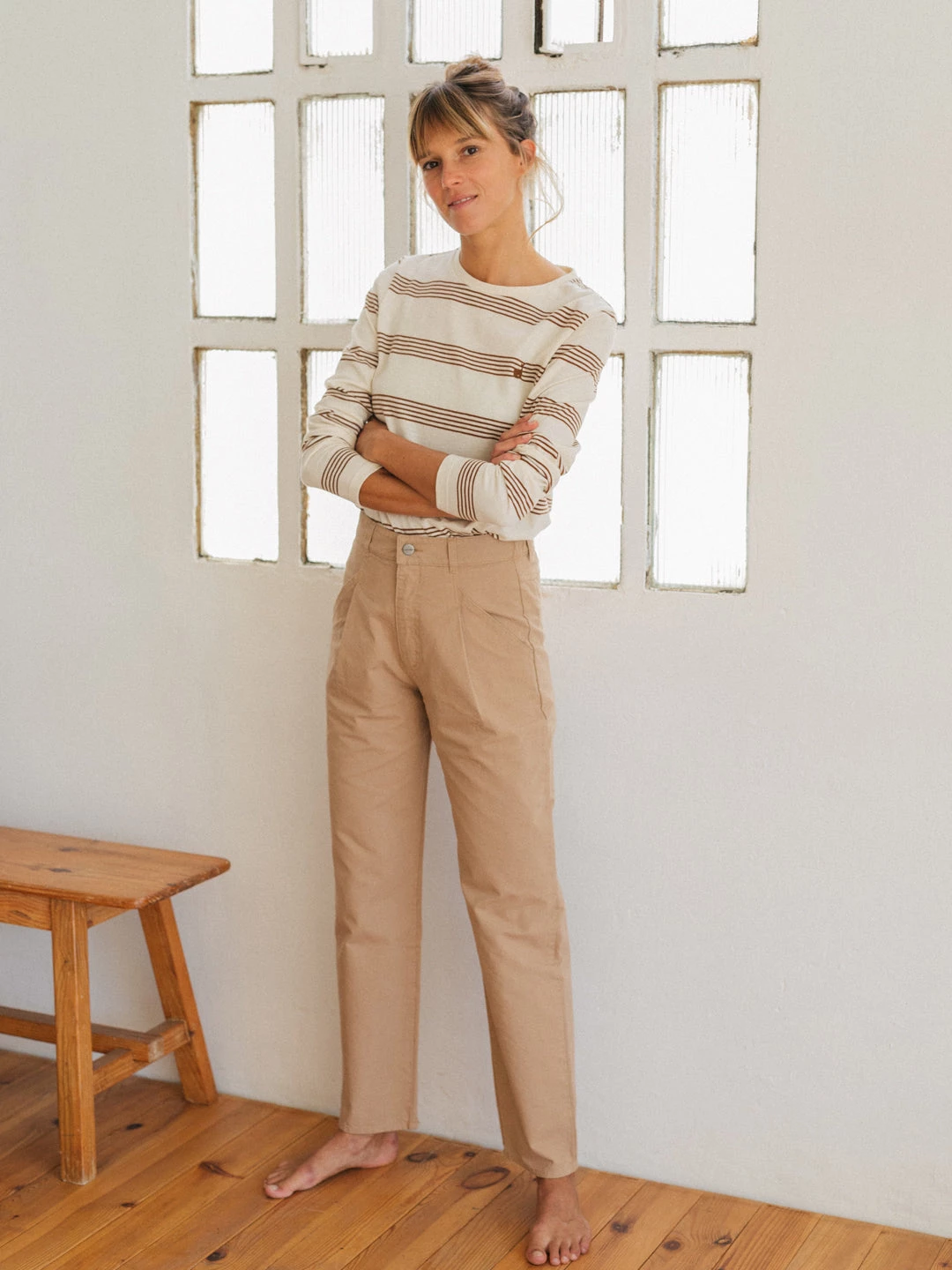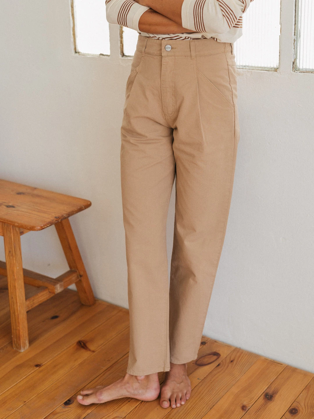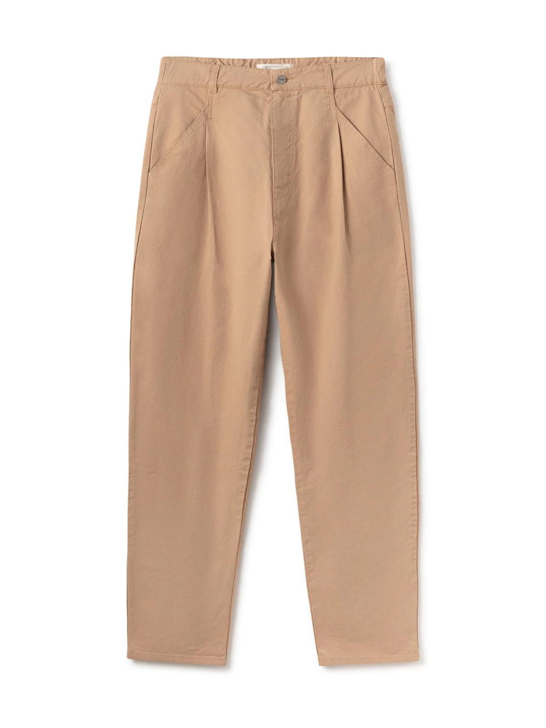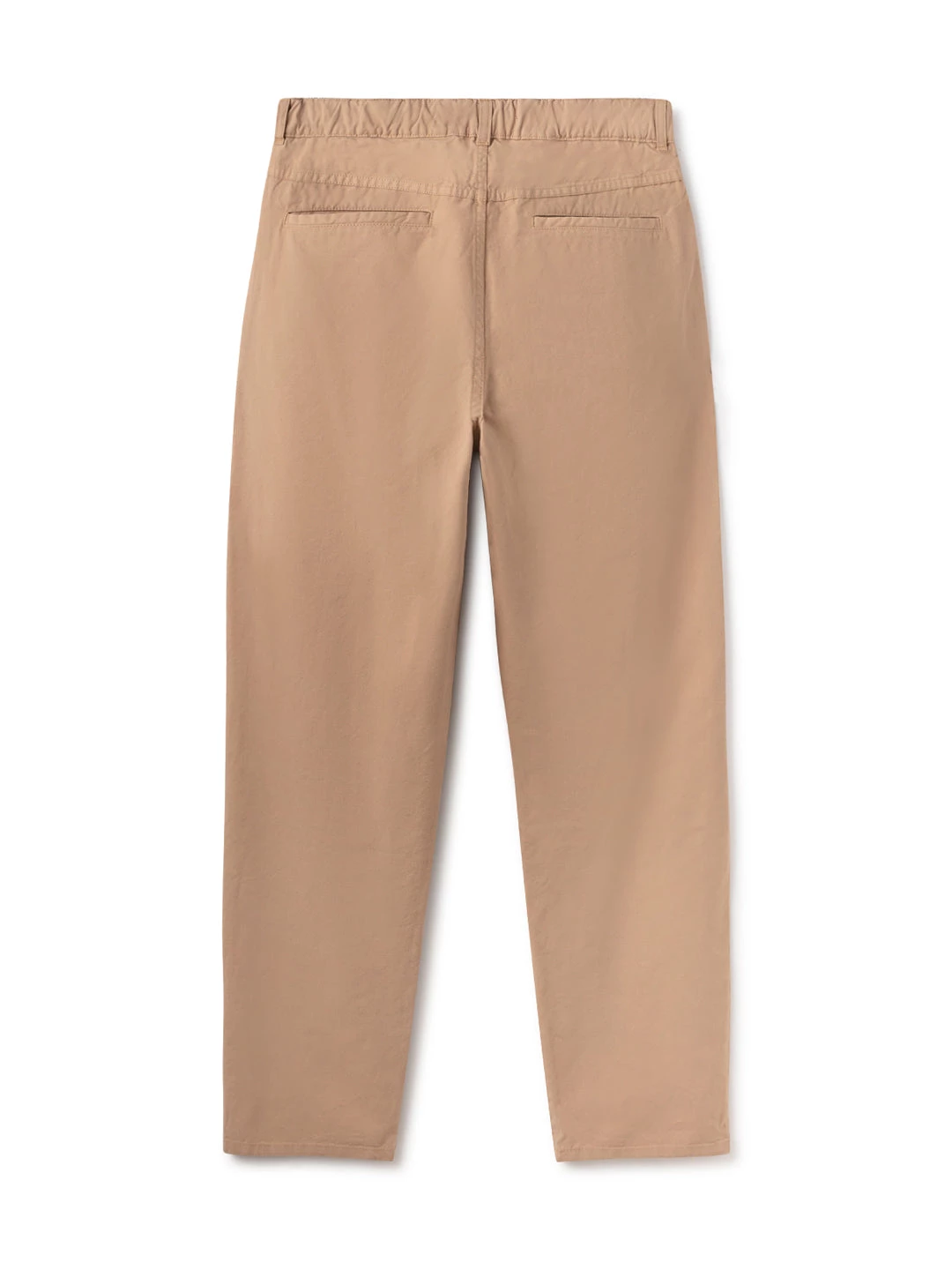The Solentiname are a pair of soft, straight-cut trousers, with pleats in the front for a fashionable touch. Featuring a matt silver button with a YKK eco finish, same with the zipper. The pants have 4 pockets in total and elastic on the back of the waist for better adjustment. Designed with a regular fit that falls to ankle-length.