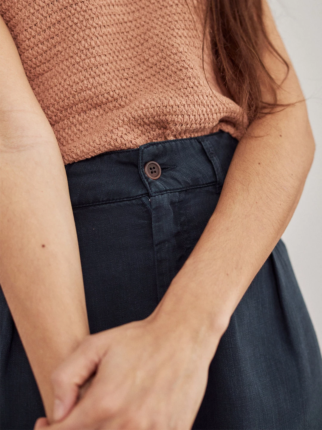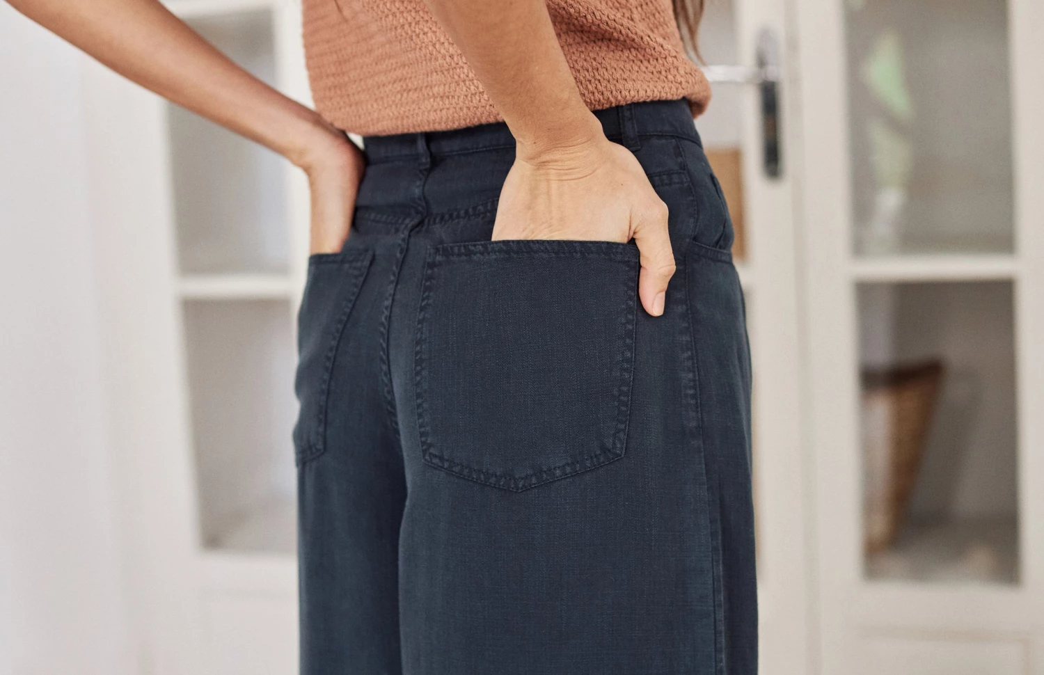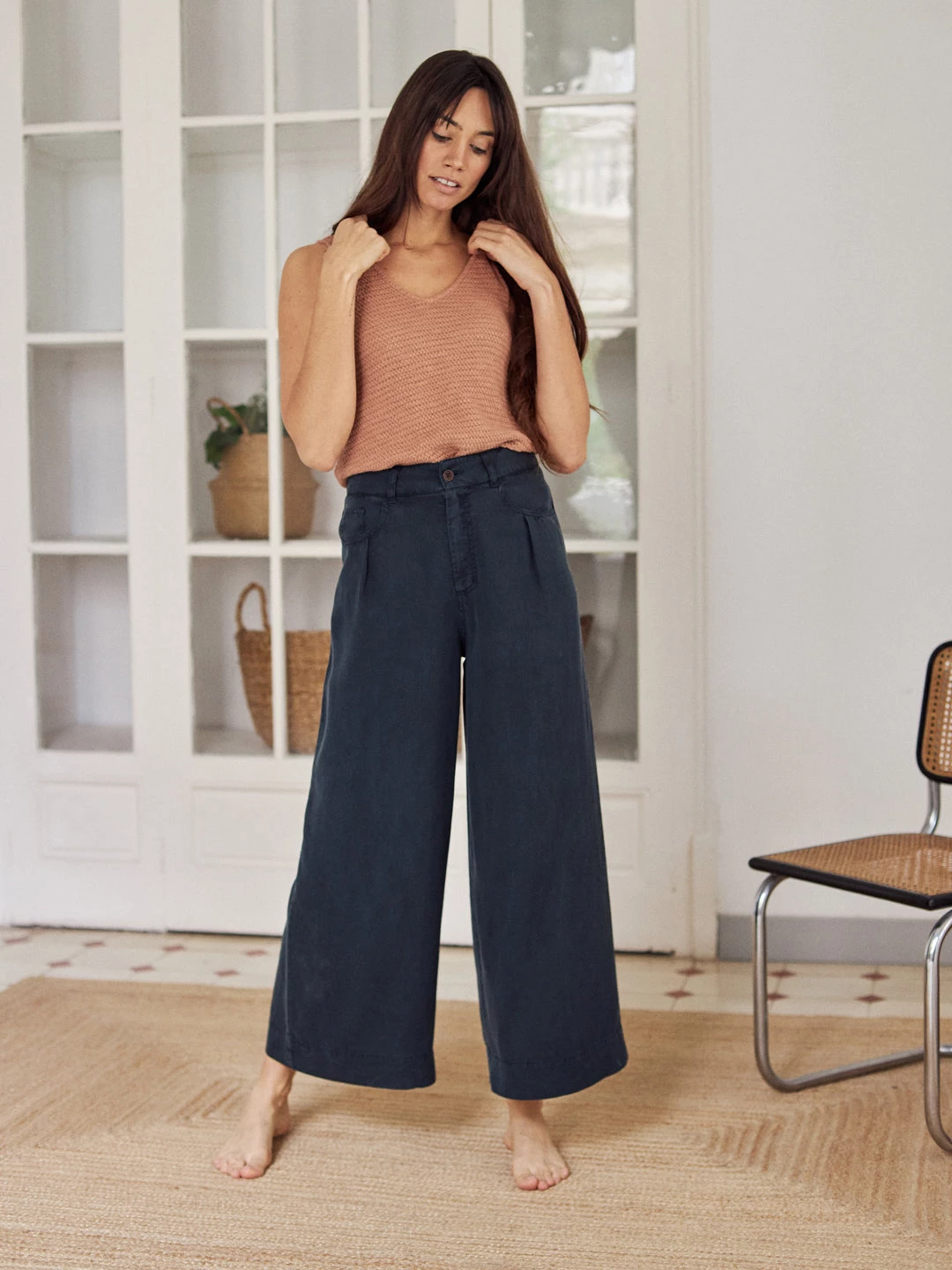 Stylish bell trousers designed in a pesticide free and silky sustainable fabric and featuring a naturally sourced corozo button. The pants have 4 pockets in total with bottom hems.Â